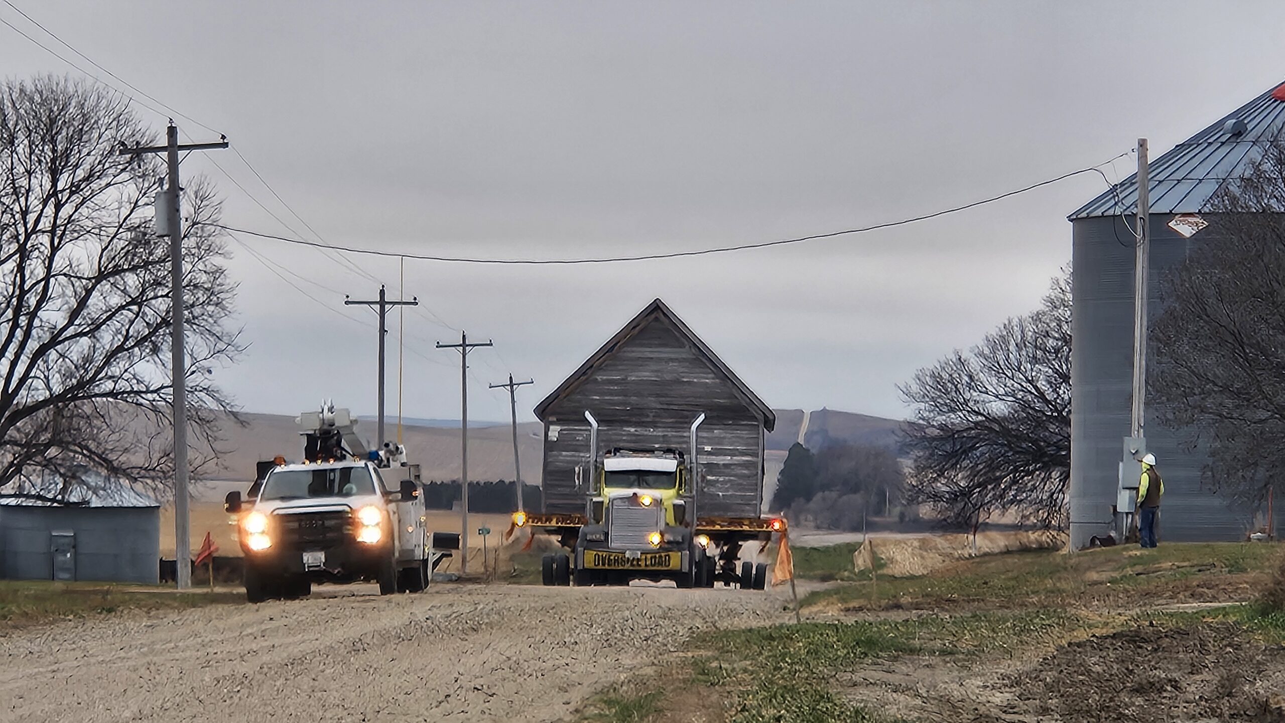 “They’re saying about an hour or so it’s going to take to get this thing down the road into the red barn visitor center,” reported Jeremy Shipe, “We’re still on dirt roads at this point. We’re going under a power line. They’ve got some poles out. They’re holding the power line up in the air so that the house can go underneath it.”