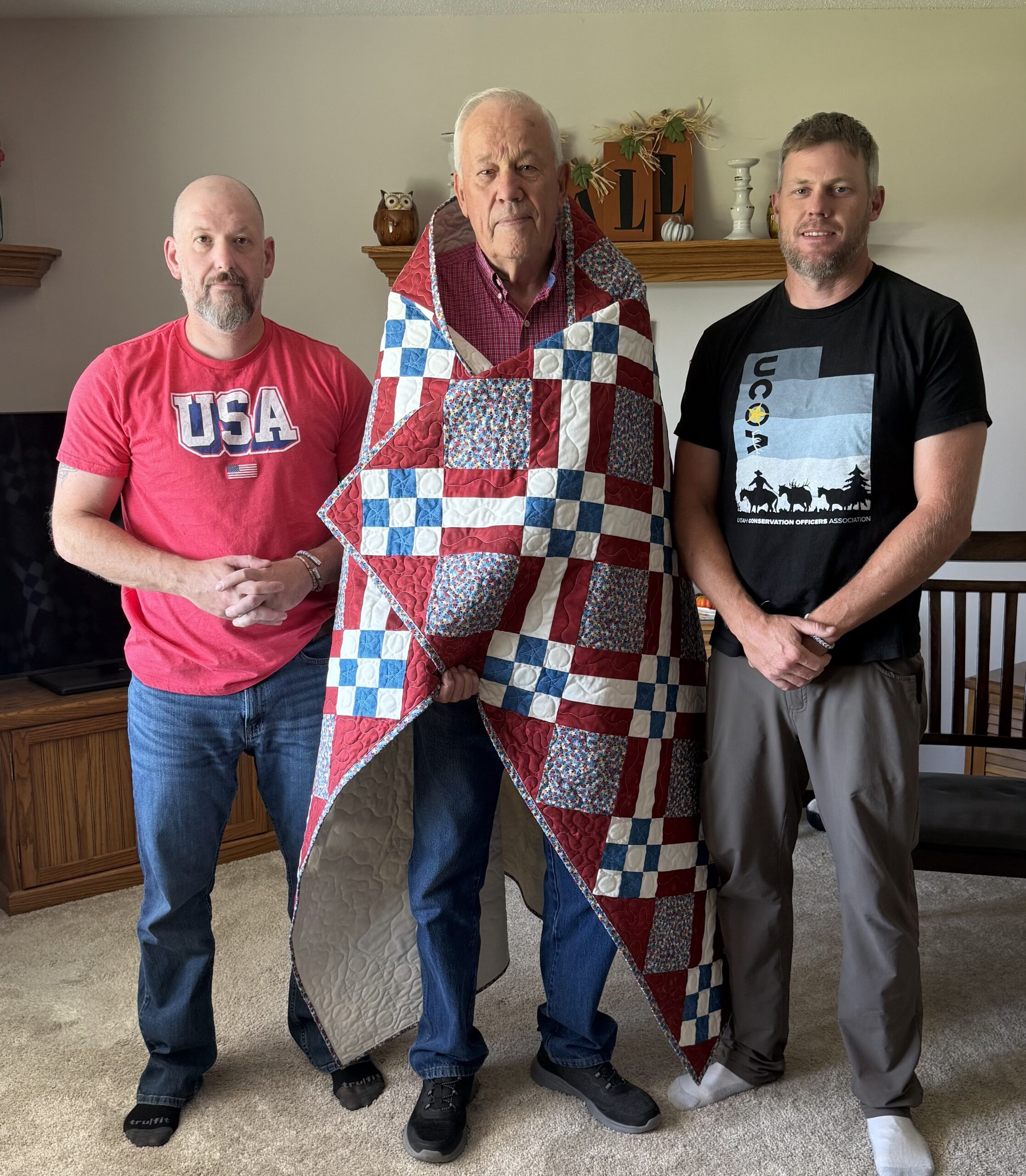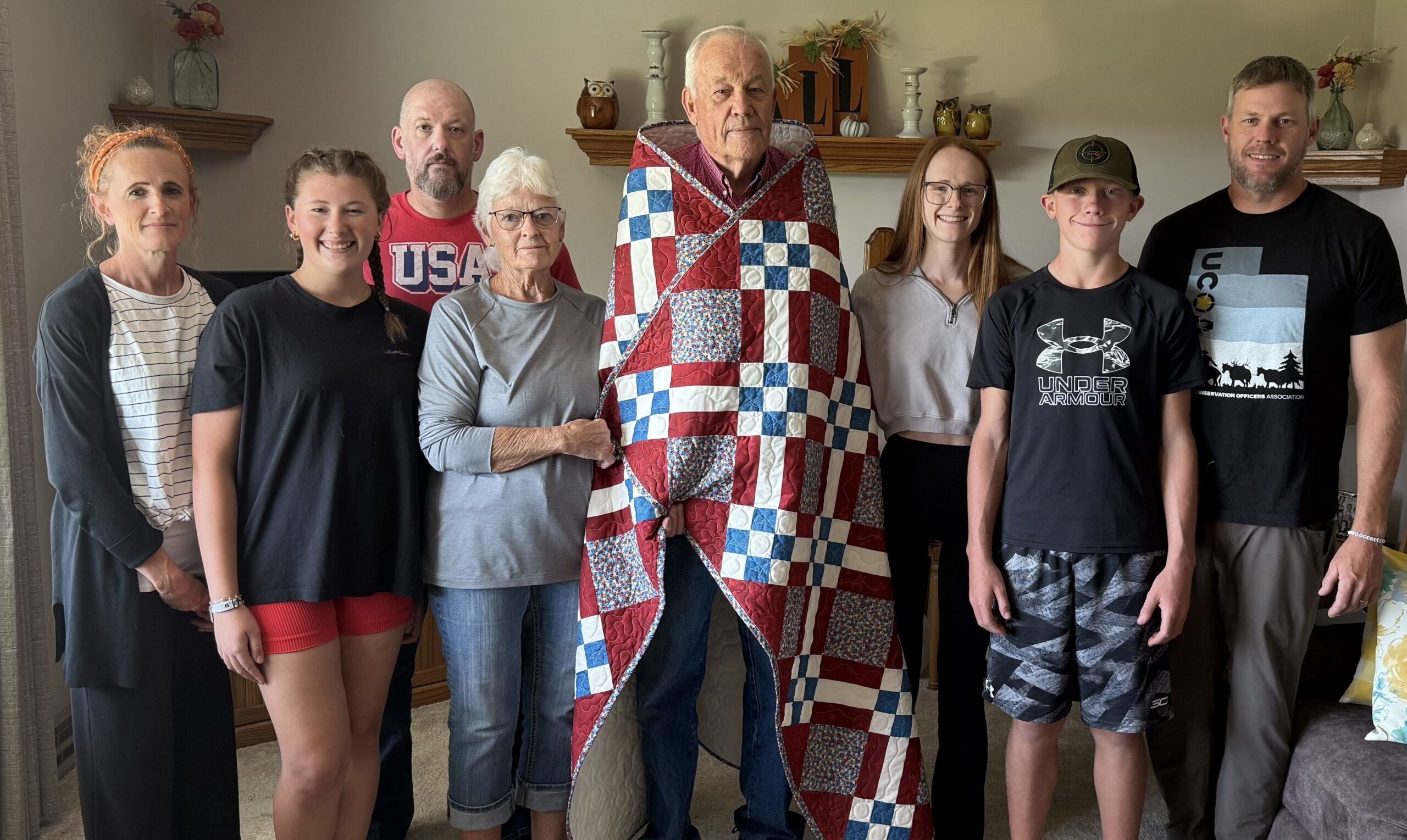 Delton Johnson was awarded a Quilt of Valor Saturday September 27th at his home just north of Broken Bow. Johnson was honored to have 2 of his sons wrap him in his Quilt of Valor. Johnson’s son Matthew and his family were visiting from Texas, his son Mitch and Mitch’s son were also present for the presentation.