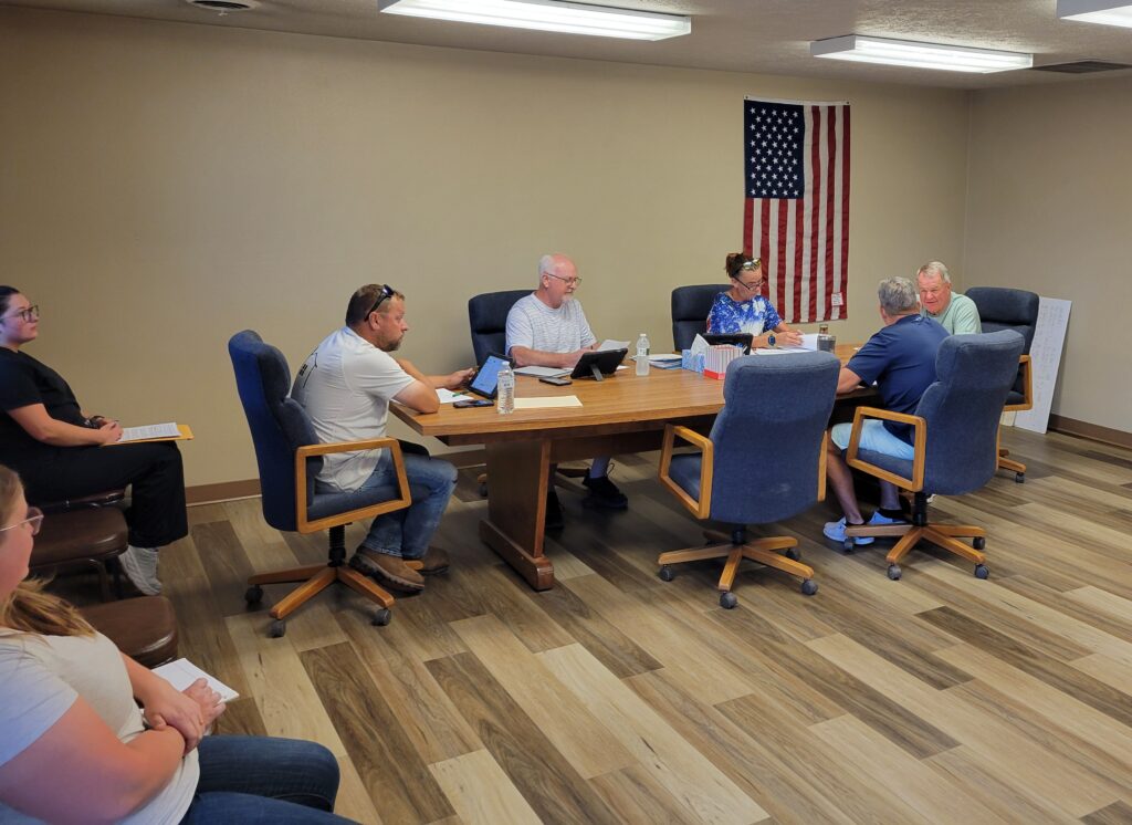 The Callaway Village Board listened to a proposal idea from the school board regarding future expansion of the school during their August board meeting, but took no action. From left are TJ Elliott, Lawrence Paulsen, Village Clerk Lori Bonde, Mark Kimball, and Darwin Mast. Dan Lewandowski was not present for the meeting. (Courier photo by Ellen Mortensen)