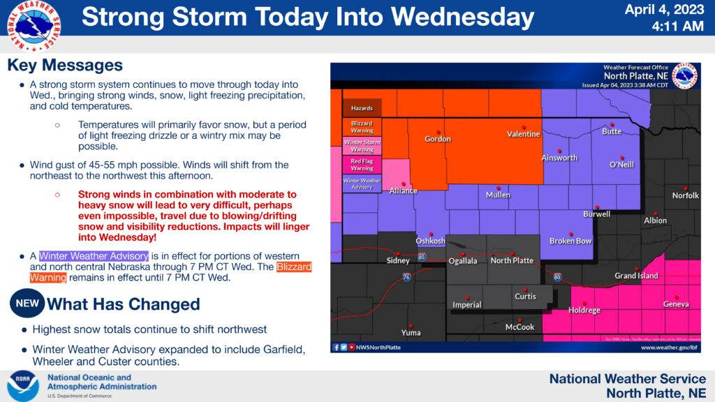 The winter weather advisory (purple on map) is in effect for portions of western and north central Nebraska through 7PM Wednesday. The blizzard warning (orange on map) also remains in effect until 7PM Wednesday.