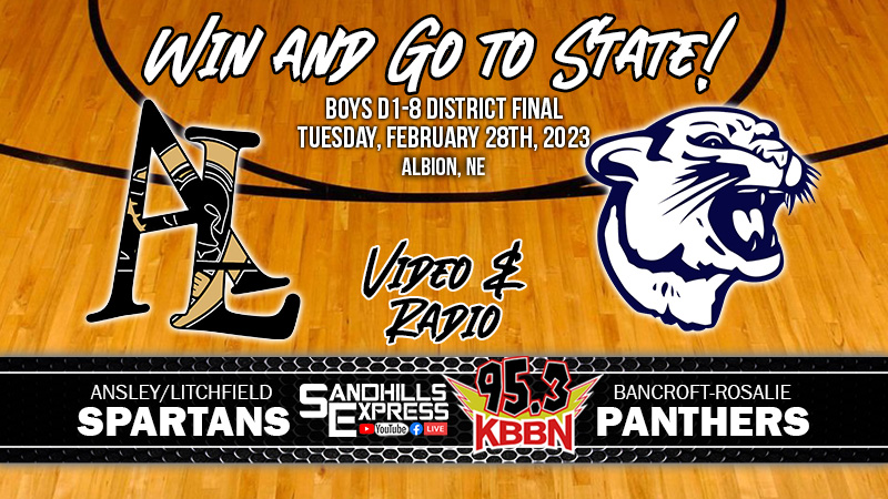 The Ansley/Litchfield and Mullen boys basketball teams will play in district finals tonight as each try to qualify for the boys state basketball tournament which begins March 8th in Lincoln. Ansley/Litchfield will face Bancroft Rosalie in the D1-8 district final at Boone Central high school in Albion. The Spartans are 18-5 this season and qualified for the district final by winning the D1-7 sub district tournament with wins over Burwell and Pleasanton. Bancroft Rosalie is 19-6 and were winners of the D1-4 sub district tournament with victories over Hartington Newcastle and Howells Dodge. Tonight’s game is scheduled to tip off at 6:30 and will be broadcast on KBBN 95.3 FM and kbbn.com. A live video stream of the game, accompanied by the radio call, will be available on the Sandhills Express Facebook page and the Sandhills Express You Tube channel.