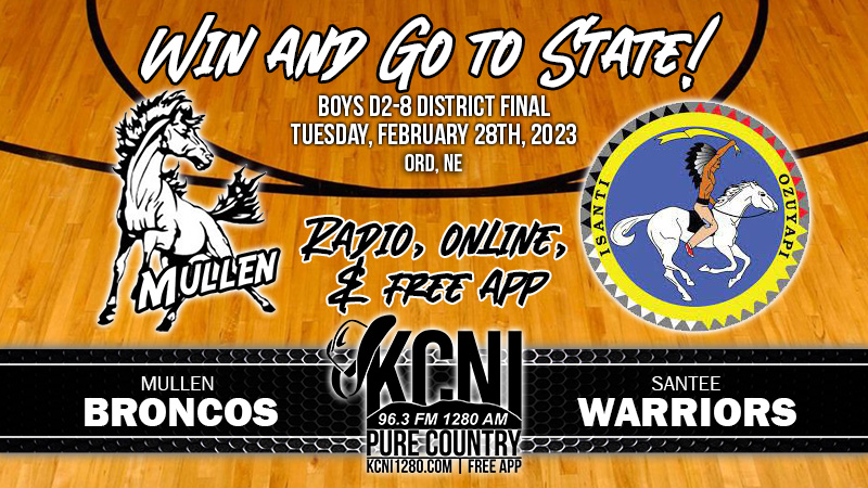 Mullen will face Santee for the D2-8 district championship tonight at Ord high school. Mullen is 17-5 on the season and qualified for the district finals as a wildcard after falling to Paxton in the D2-10 sub district final last week. Santee is 14-5 and also qualified for the district finals as a wildcard after falling to Stuart in the finals of the D2-5 sub district tournament. Tonight’s game is scheduled to tip off at 6 p.m. and will be broadcast locally on KCNI 1280 AM and 96.3 FM. The game will also be broadcast on the internet at kcni1280.com and on the free KCNI Pure Country app.