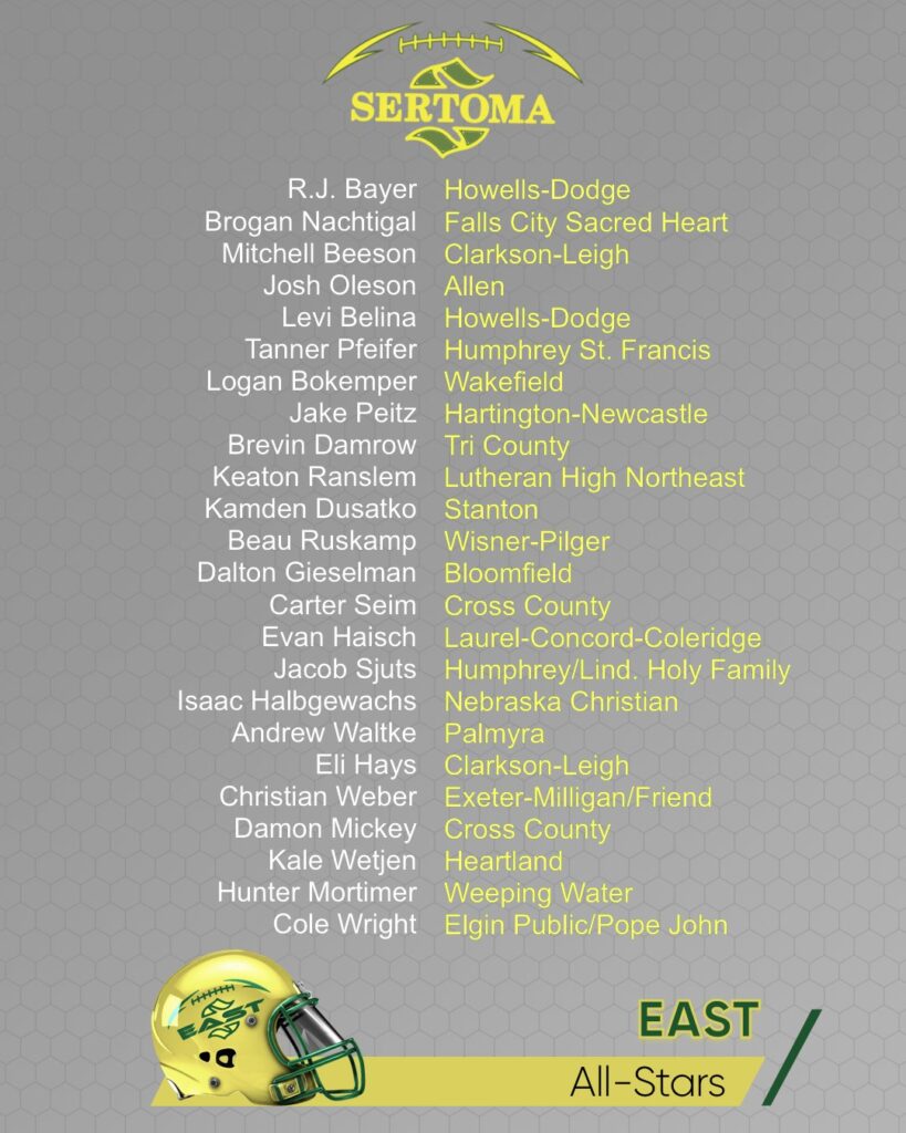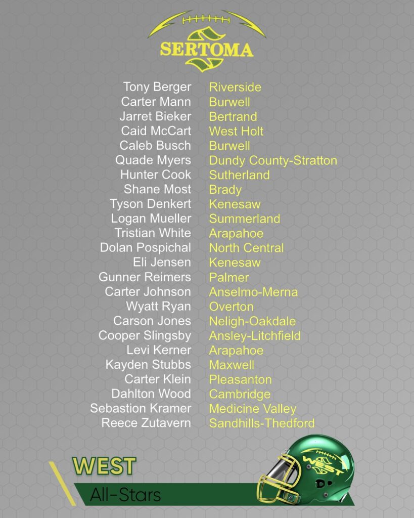 The 45th annual Sertoma 8 man football all star game will take place this Saturday, June 18 in Hastings kicking off at 6 p.m. A handful of area athletes have been chosen to compete at this summer’s all star classic. Suiting up for the West team at this year’s game will be Cooper Slingsby (Ansley/Litchfield), Carter Johnson (Anselmo-Merna), Reece Zutavern (Sandhills/Thedford), as well as Caleb Busch and Carter Mann (Burwell). The west team will be coached by Sandhills/Thedford head coach Josh Deines along with Andy Seaman of Brady, Dustin Kronhofman of Arapahoe, and Kolby Hamilton of Maywood Hayes Center.
