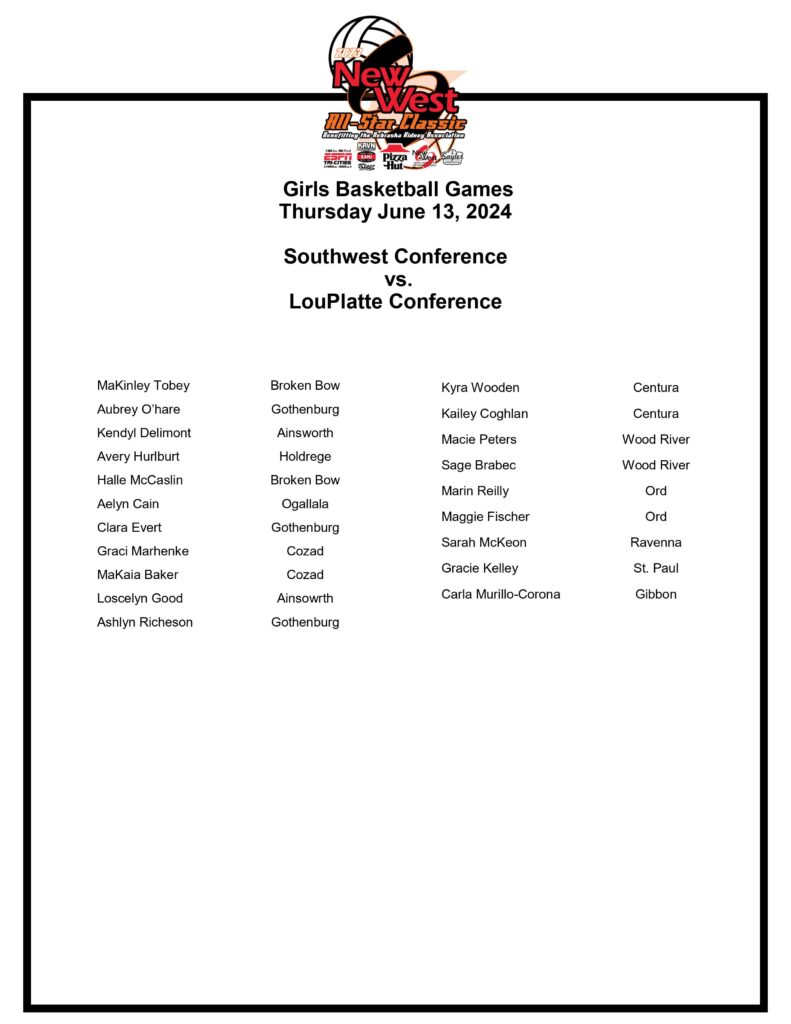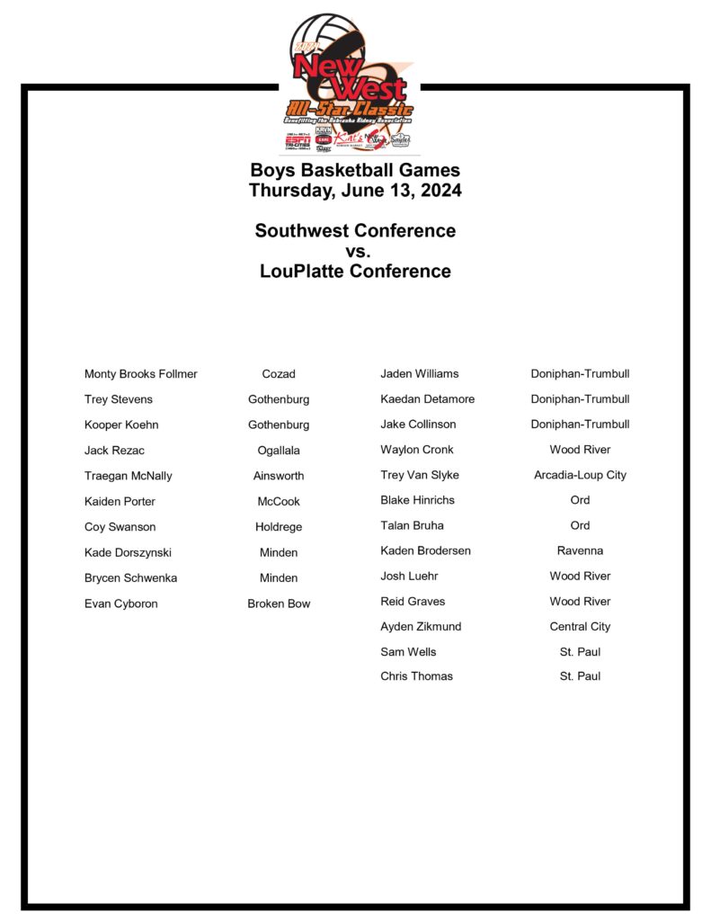 The All Star basketball games are scheduled for June 13th. The girls games will tip off first at 5 p.m. and will feature the SWC all stars vs the Lou Platte Conference all stars while the RPAC all stars will face off against the FKC. The boys all star games will follow featuring the same conference matchups.
