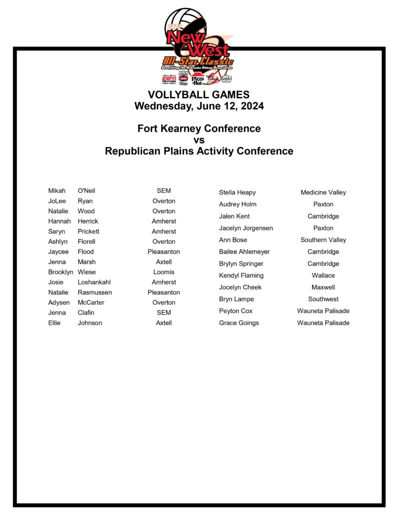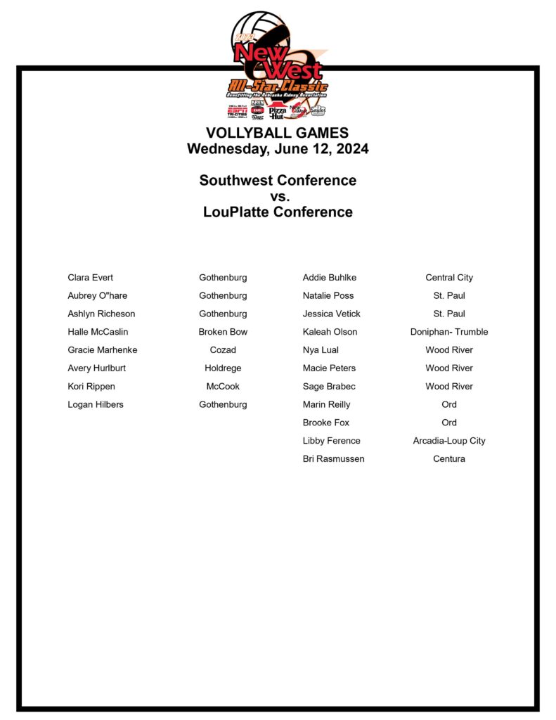 The All Star volleyball matches are scheduled for June 12th beginning at 5 p.m. Opening round matches will feature the Lou- Platte Conference vs the Southwest Conference while the FKC will face the RPAC. The championship and consolation matches will follow.