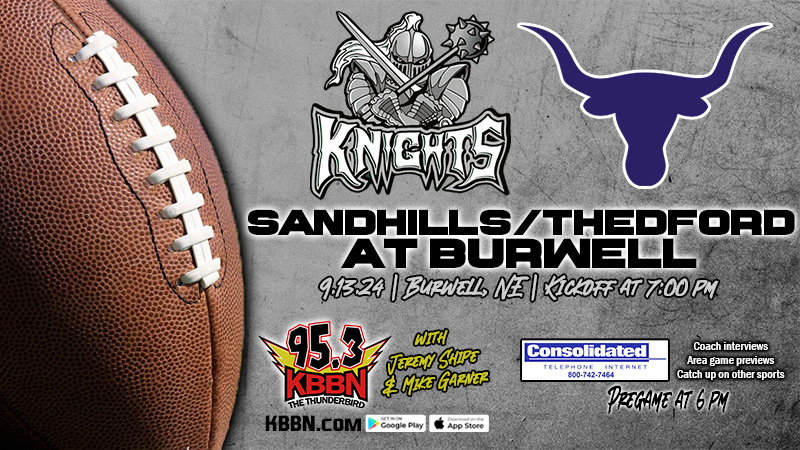 Tonight’s game between Burwell and Sandhills/Thedford will be broadcast on KBBN 95.3 FM and kbbn.com. Coverage begins with the Consolidated pregame show at 6 and kickoff is scheduled for 7 p.m.