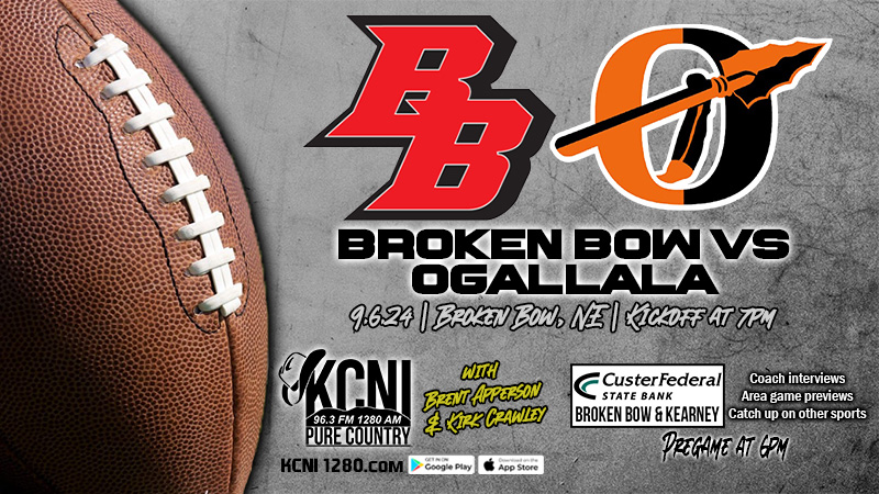 Tonight’s Broken Bow / Ogallala game will be broadcast on KCNI 96.3 FM and kcni1280.com.  Coverage begins with the Custer Federal State Bank pregame show at 6 p.m. with kickoff scheduled for 7.