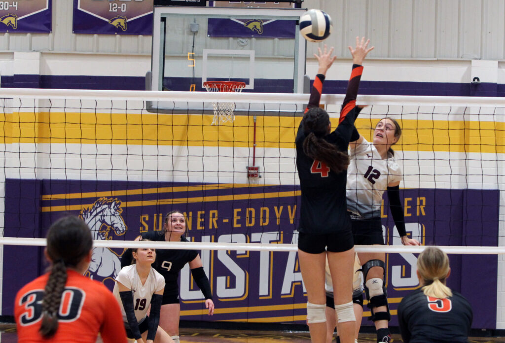 The Sumner-Eddyville-Miller Mustangs hosted a five team subdistrict that started play on Monday night. The opening match of the night put #4 Palmer up against #5 Twin Loup. The match would prove to be a thriller, going the distance to five sets in length. Palmer would take the win 3-2 (25-20, 24-26, 25-21, 23-25, 15-11) and advance to play the host S-E-M.