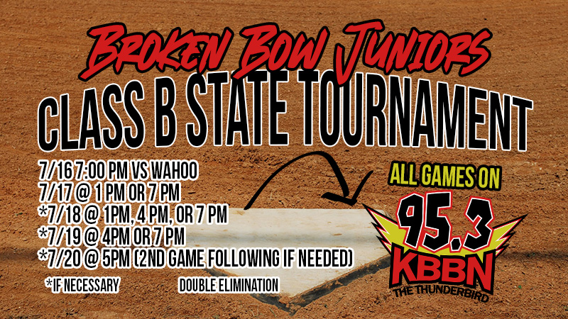 The Broken Bow American Legion juniors baseball team opened play at Class B state tournament Saturday in Wahoo. Bow dropped a heartbreaker to the host team 5-4. After each team scored a run in the first inning, Wahoo scored two in the third to take a 3-1 lead. The score remained that way until the fifth when Broken Bow put together a two out rally and scored two to tie the game. The score remained tied 3-3 going into the 7th when Brice Chaplin came around to score on a throwing error to give Broken Bow the lead. In the bottom of the 7th, Wahoo loaded the bases on three straight walks with one out and scored the tying run on a shallow fly ball to center that dropped for a hit. Wahoo then scored the winning run on an error claiming a walk off win 5-4. Broken Bow had only two hits in the game. Max Denson was 1 for 3 with 1 RBI and Coy Wardyn was 1 for 3 with an infield single in the 7th which led to the run that gave Broken Bow a 4-3 lead. With the loss, Broken Bow drops down to the elimination bracket where they will face Hickman Sunday afternoon at 1 p.m. The game will be broadcast on KBBN 95.3 FM and on kbbn.com.