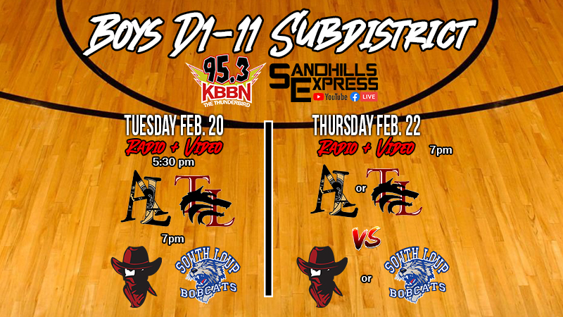 Sandhills/Thedford hosts the D2-9 sub district in Thedford beginning tonight. S/T is the top seed and will face Brady tonight while Mullen will meet Anselmo-Merna in the 2/3 matchup. The winners of tonight’s games will face off for the sub district championship on Thursday.
