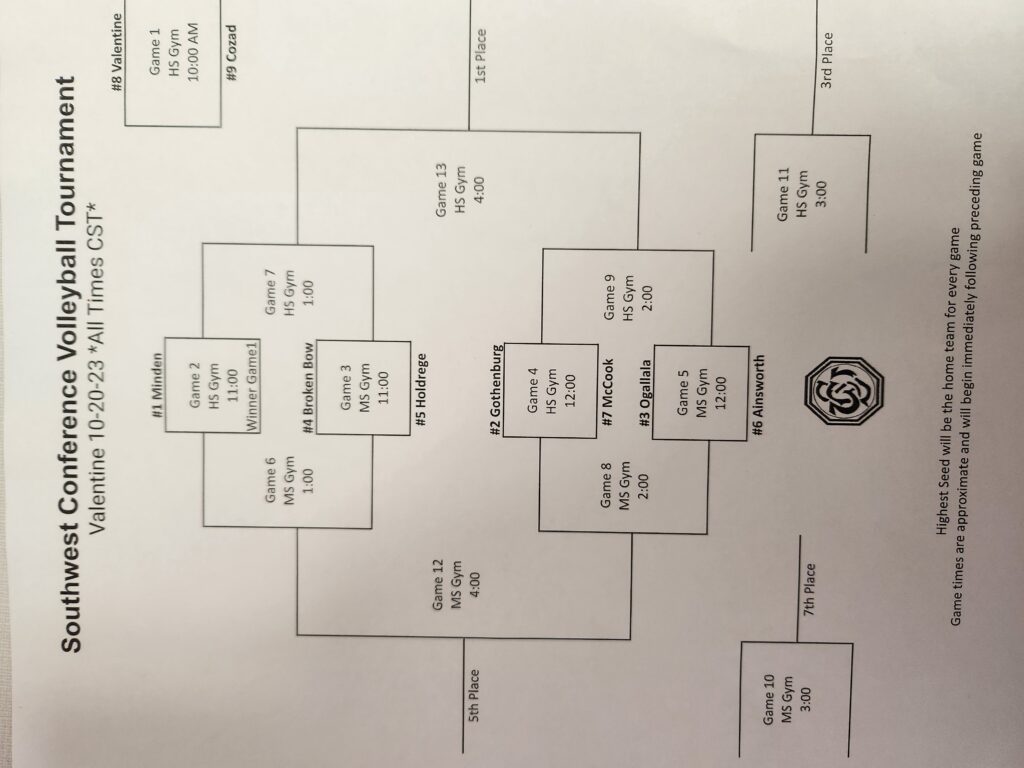 The bracket has been released for the Southwest Conference volleyball tournament which takes place Friday (10/20) at Valentine. Broken Bow is the #4 seed and will open play against #5 seed Holdrege in the quarterfinals. The match is scheduled for 11 a.m. at Valentine Middle School gym. Other quarterfinal matches will feature top seed Minden against the winner of Cozad / Valentine. #2 seed Gothenburg will face McCook and #3 seed Ogallala will play Ainsworth.