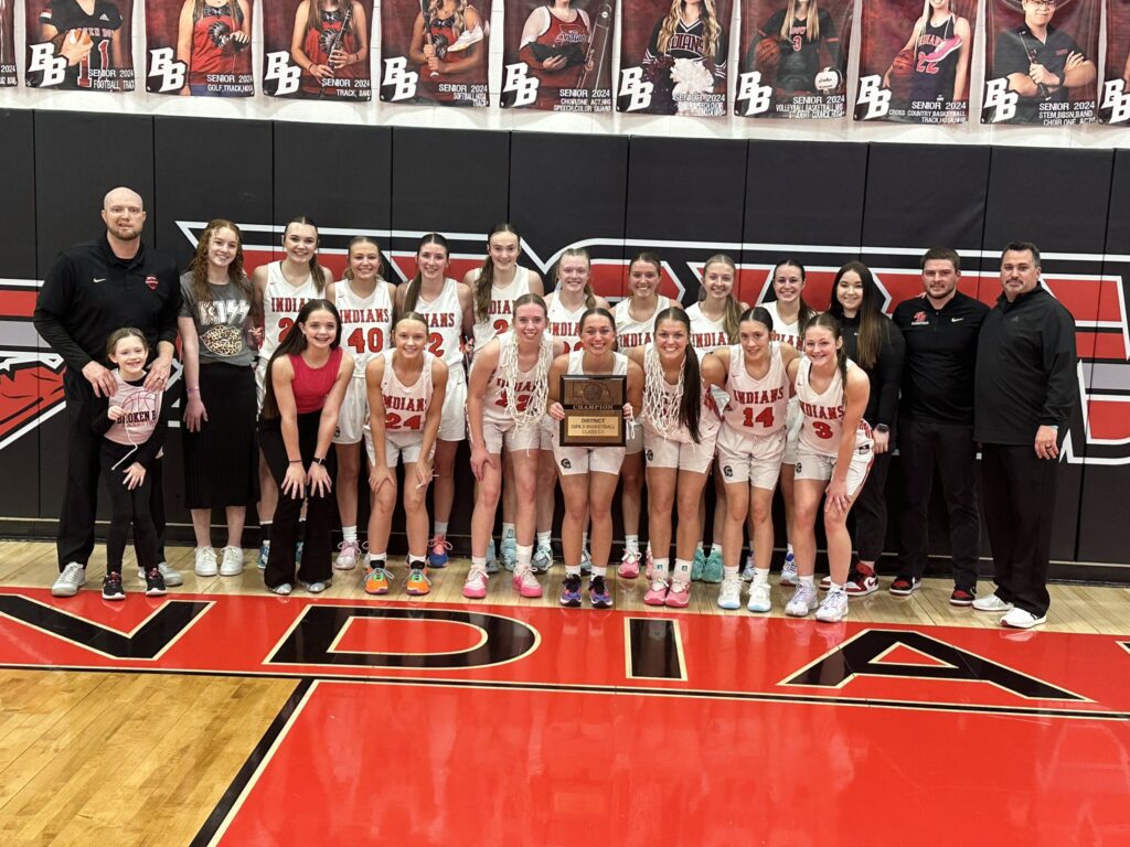 The Broken Bow girls basketball team claimed their third district championship in the last four years by outlasting Battle Creek, in overtime, 53-49 to win the C1-6 district title. Broken Bow built an eleven point lead late in the 2nd quarter but Battle Creek went on a 6-0 run to end the quarter and pulled to within 23-18 at halftime and the game was tight the rest of the way. Battle Creek took their first lead with under 4 minutes left to play and led by as many as three but Broken Bow fought back to tie the game at 44-44 to force overtime. In overtime, MaKinley Tobey hit a three to put Broken Bow on the board first and the Lady Indians would outscore Battle Creek 9-5 in the overtime period to win 53-49. Tobey led all scorers with 17 points. Halle McCaslin also scored in double figures for the Lady Indians with 16 and Gaby Staples had 13. With the win, Broken Bow advances to the NSAA girls state basketball championship tournament next week in Lincoln.