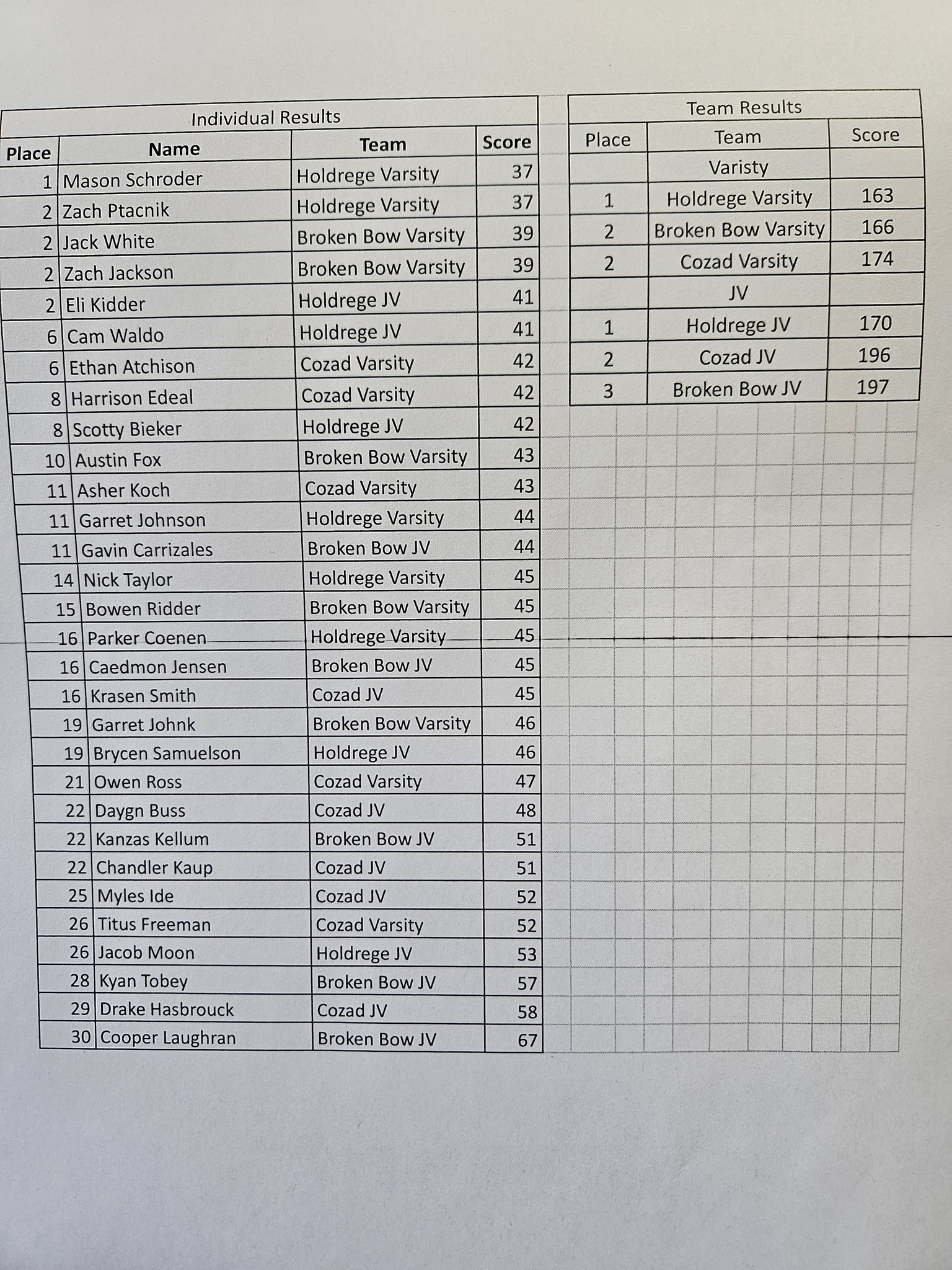 The low round of the day was turned in by Mason Schroder and Zach Ptacnik of Holdrege who both finished with a 37. Jack White and Zach Jackson led Broken Bow with rounds of 39. Austin Fox of Broken Bow finished in the top 10 with a round of 43.