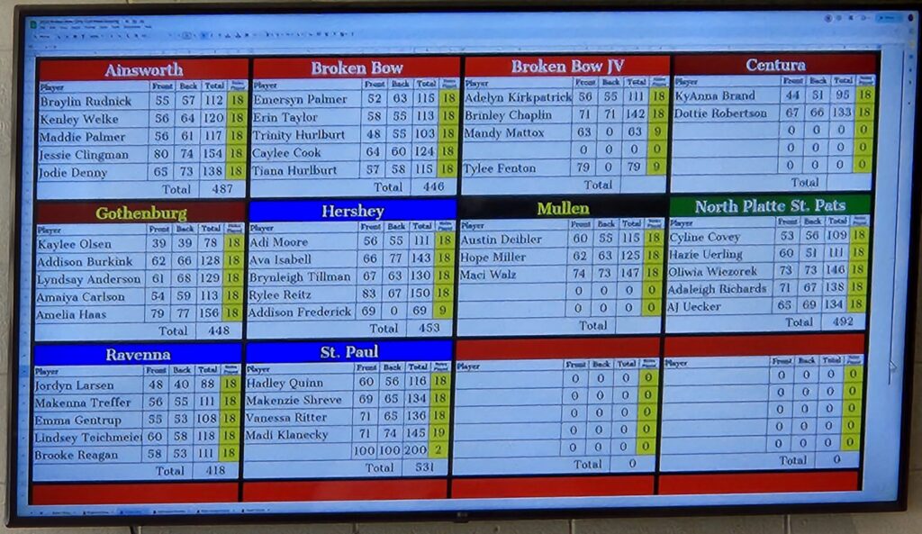 The Broken Bow girls golf team was runner-up at its home invite held at the Broken Bow Golf Club and Golf Course on Tuesday. It was near perfect conditions for the meet. Ravenna was the team champion with a low team score of 418 followed by Broken Bow in 2nd with a 446 team score. Four Broken Bow golfers medaled in the top 15 individually. Trinity Hurlburt had the best round of the day for Broken Bow with a 103 which was fourth best overall. Adelyn Kirkpatrick placed 9th with a 111, Erin Taylor was 13th with a 113, and Emersyn Palmer was 15th with a 115. Tiana Hurlburt of Broken Bow and Austin Deibler of Mullen also finished with rounds of 115 but just missed medaling in the top 15 based on tie break criteria. Kaylee Olsen of Gothenburg was the individual champion with a low round of 78.