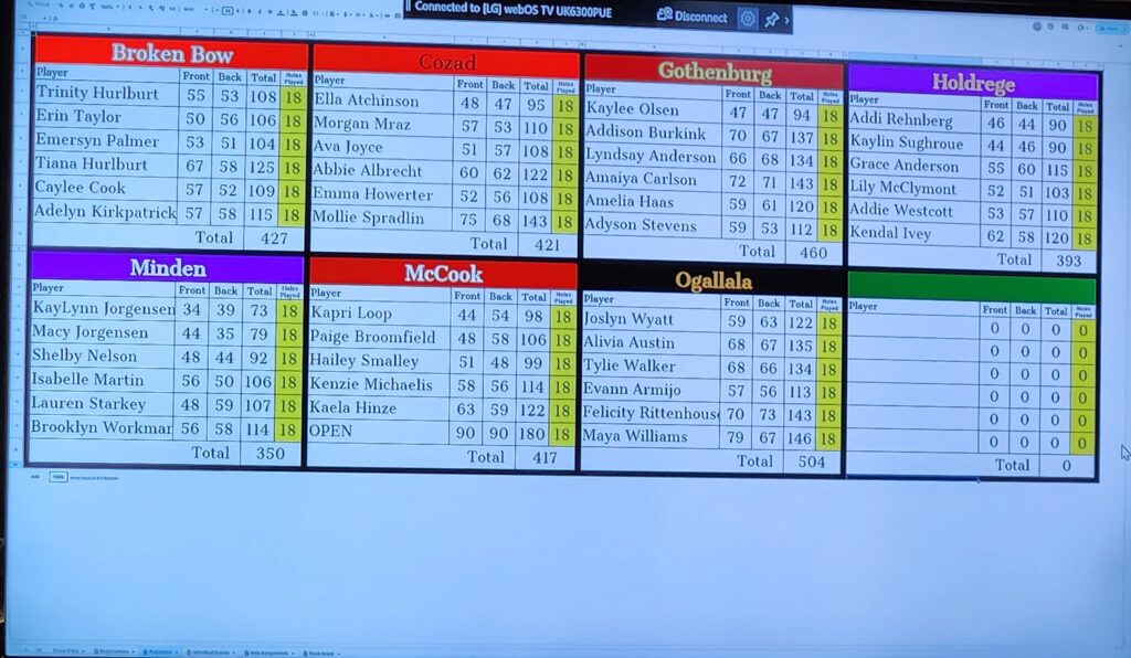 Broken Bow played host to the Southwest Conference girls golf tournament on Tuesday at the Broken Bow golf club and golf course. Minden was the team champion with a low team score of 350. Holdrege was runner up with a 393 and McCook was third with a 417. Broken Bow finished 5th with a 427 team score.