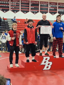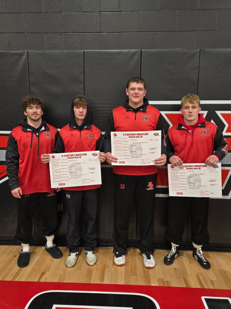 Broken Bow qualified four wrestlers for state. The Indians finished with three district champions. Braxon Rynearson was champion at 150 lbs. winning by a 3-1 decision over Chaz Erickson of Kearney Catholic in the championship match. Cobe Wells was the district champion at 175 lbs. Wells won by major decision over Tristan Koch of Gothenburg in the title match and Devon Baum was district champion at 285 lbs. winning by fall over Boston Krueger of Pierce in the championship match. Also qualifying for state was Aidan Markham who finished third at 165 lbs.
