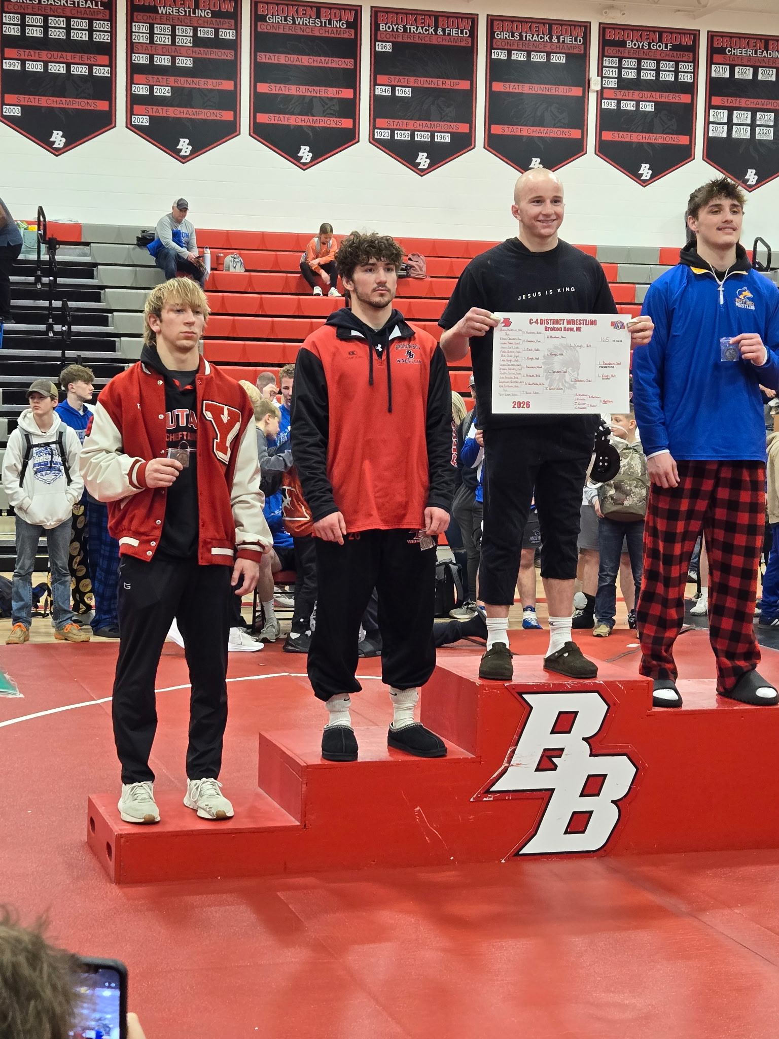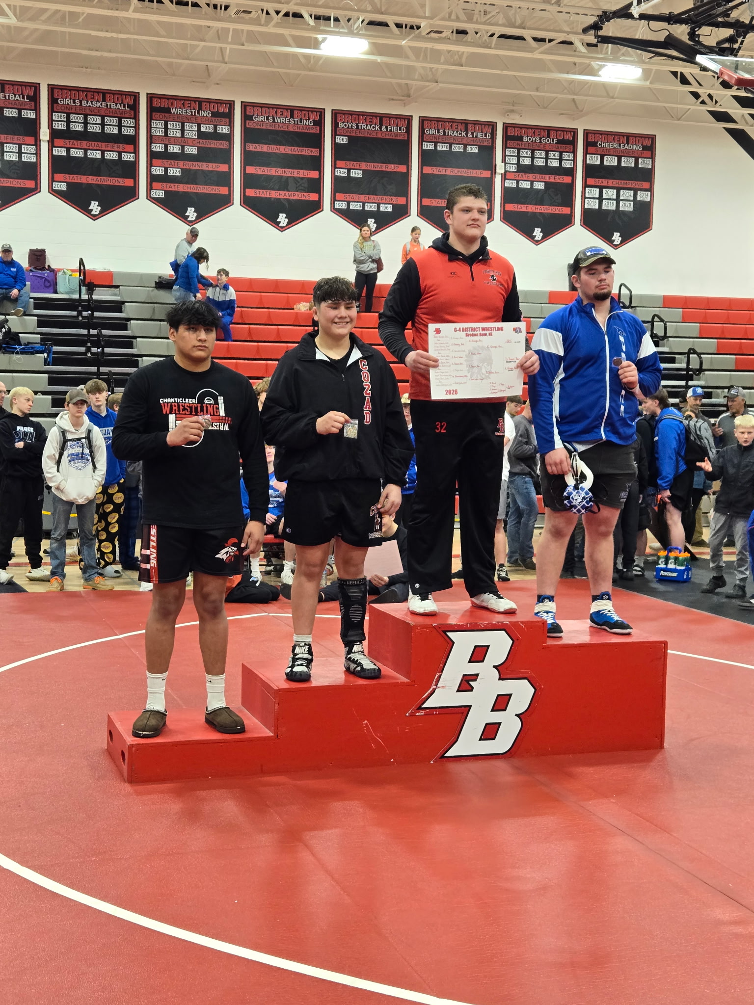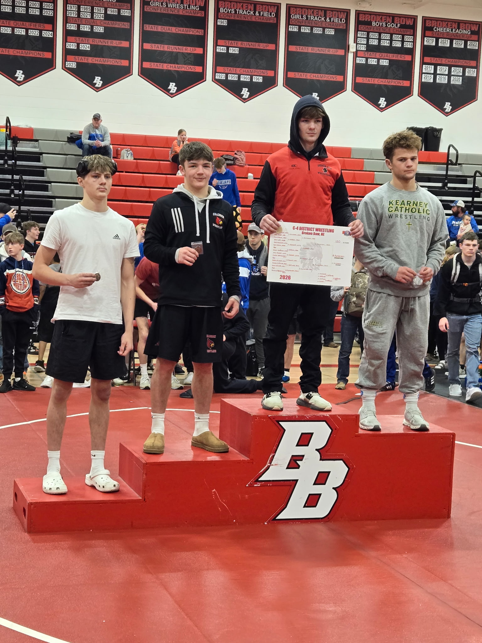 Broken Bow hosted the C-4 district wrestling championships on Saturday. Broken Bow finished in a tie with Gibbon for third in the team standings with 115 points. Pierce was the district team champion and Chadron was team runner up. The top four wrestlers in each weight class qualified for the NSAA state championship tournament in Omaha.