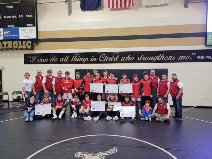The Broken Bow wrestling team claimed the team title at the Aquinas Catholic Invite in David City on Saturday. Bow claimed the championship with 257 points and Aquinas was runner-up with 238.5 points. The Indians claimed seven individual championships on the day. Placing first in their weight class were Chauncey Watson at 113 lbs., Cash Watson at 120, Colton Kelley at 132, Jerry Sittler at 160, Jack Myers at 170, Connor Wells at 182, and Cal Wells at 220 lbs. Other medal winners for Broken Bow included Tallen Harrold 3rd at 138 lbs., William Moninger 4th at 145, Dakota Baum 3rd at 152, Brice Chaplin runner-up at 170, Max Denson runner-up at 195, and Hagen Campbell runner-up at 285 lbs.