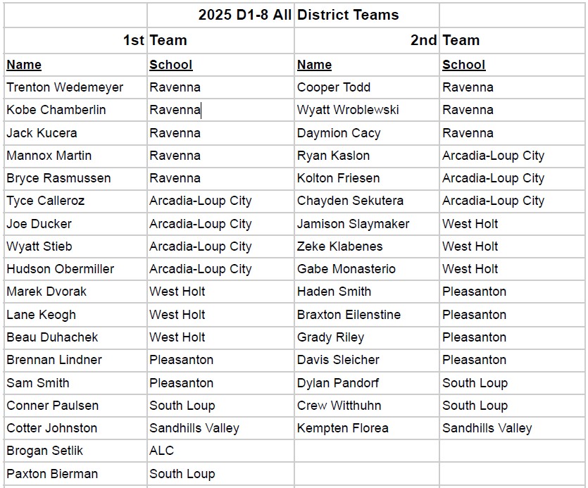 The D1-8 all district football team has been announced. Area teams from the KCNI/KBBN coverage area who competed in the district this season included Arcadia/Loup City, South Loup, and Sandhills Valley. The D1-8 champion was Ravenna. Ravenna and Arcadia/Loup City were district representatives in the Class D1 state football playoffs.