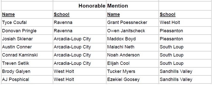 Area athletes receiving all district second team honors were Ryan Kaslon, Kolton Friesen, and Chayden Sekutera of Arcadia/Loup City, Dylan Pandorf and Crew Witthuhn of South Loup, and Kempten Florea of Sandhills Valley.