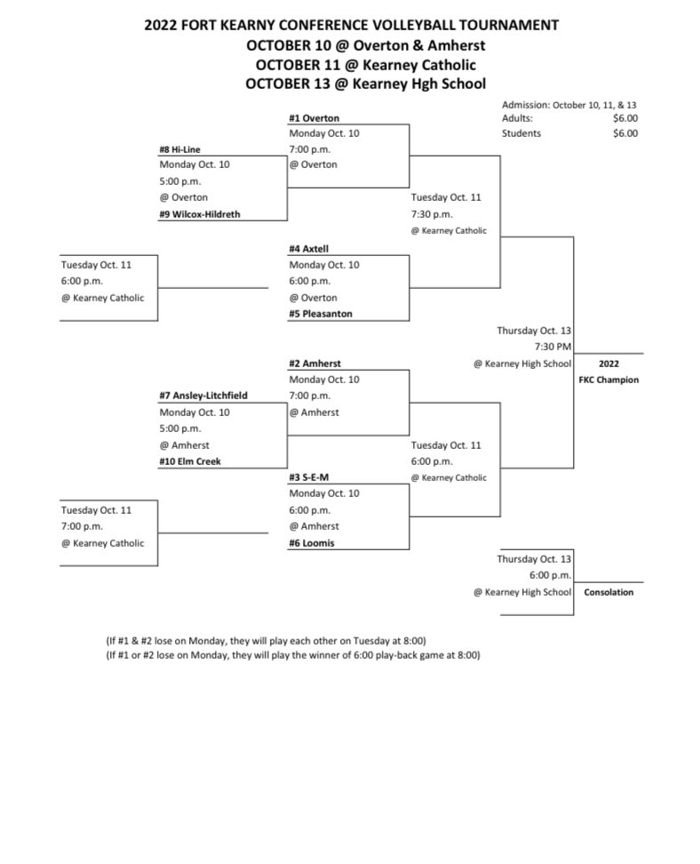 The Fort Kearny Conference volleyball tournament begins today with opening round games at Overton and Amherst. Ansley/Litchfield is the #7 seed in the ten team tournament. The Lady Spartans will face Elm Creek at 5 p.m. at Amherst with the winner advancing to play the #2 seed Amherst later in the evening. SEM is the #3 seed in this year’s tournament. The Lady Mustangs will face the #6 seed Loomis this evening at Amherst. On the other side of the bracket, Hi-Line will face Wilcox-Hildreth at 5 p.m at Overton with the winner advancing to face the top seed Overton later in the evening. The other match at Overton will feature the #4 seed Axtell vs. #5 seed Pleasanton. The winners of tonight’s matches will advance out to the semifinals which will be played at Kearney Catholic on Tuesday. The third place consolation and championship matches will be played Thursday at Kearney High School.