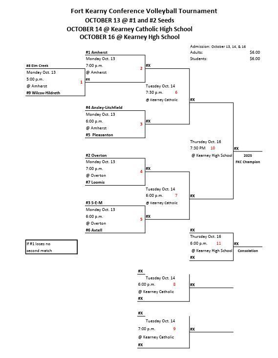 The Fort Kearny Conference volleyball tournament bracket has been released. Amherst and Overton are the top two seeds in the tournament and will host opening round games on Monday October 13.