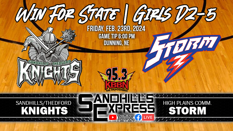 Sandhills/Thedford will host High Plains Community for the D2-5 district championship tonight. The game will be played at Sandhills High School in Dunning. Sandhills/Thedford has put together an outstanding season and enters tonight’s game at 20-4 overall. The Lady Knights won the D2-8 sub district tournament with wins over Ansley/Litchfield and Anselmo-Merna. Their opponent, High Plains Community, is 16-8 this season and advanced to the district finals by winning the D2-3 sub district tournament with wins over St. Edward and Nebraska Lutheran. Tonight’s game will be broadcast on KBBN 95.3 FM and kbbn.com. A live video stream of tonight’s game, accompanied by the radio call, will be available through sandhillsexpress.com on the Sandhills Express Facebook page and the Sandhills Express You Tube Channel. Tip off is scheduled for 6 p.m.