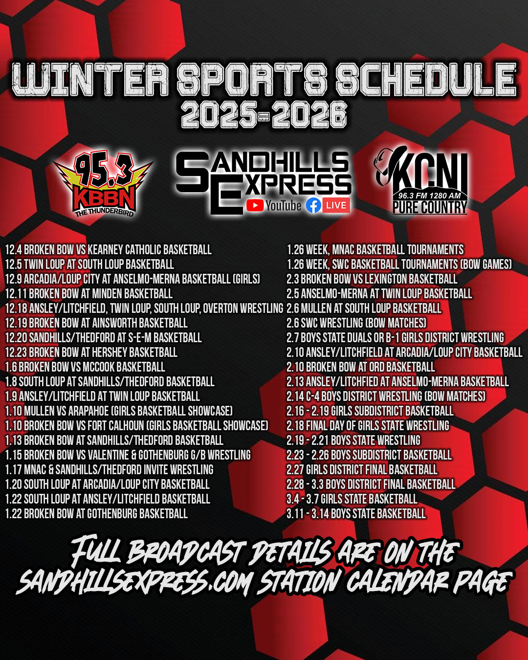 Below, you will find a graphic showing all of the events we plan on covering this season. Throughout the season, please refer to the station calendar page of SandhillsExpress.com for the most up-to-date information regarding our coverage (especially in the postseason).