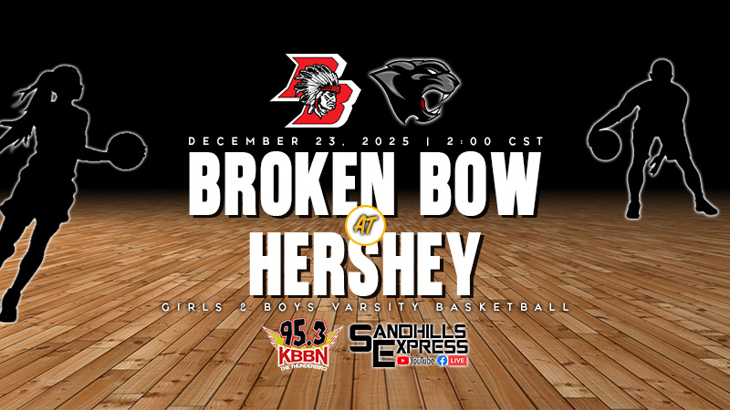The Broken Bow girls and boys basketball teams travel to Hershey today for a doubleheader with the Panthers.  After starting the season 1-3, the Broken Bow girls have won their last three with wins against St. Paul, Ainsworth, and Chase County.  They will face a Hershey team who is off to a 4-1 start with their only loss to undefeated and top ten ranked Ogallala.  The Broken Bow boys are off to a 4-2 start following back to back wins against Ainsworth and Chase County last week.  The Hershey boys enter at 1-4 with their lone win coming against Kimball.  Today’ games will be broadcast on KBBN 95.3 FM and kbbn.com.  A live video stream of the games, accompanied by the radio call, will be available on the Sandhills Express Facebook page and  Sandhills Express You Tube Channel.  The girls varsity game is scheduled to tip off at 2 p.m. with the boys game to follow.