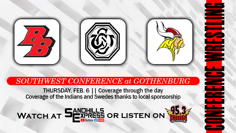 The Southwest Conference wrestling championships will take place today at Gothenburg. Broken Bow will be among the teams that compete along with Ogallala, Valentine, Minden, Gothenburg, Cozad, McCook, and Holdrege. Coverage of today’s meet can be heard on KBBN 95.3 FM and kbbn.com with matches scheduled to begin at 11 a.m. A video stream of today’s meet, accompanied by the radio call, will also be available through sandhillsexpress.com on the Sandhills Express Facebook page and Sandhills Express You Tube Channel.