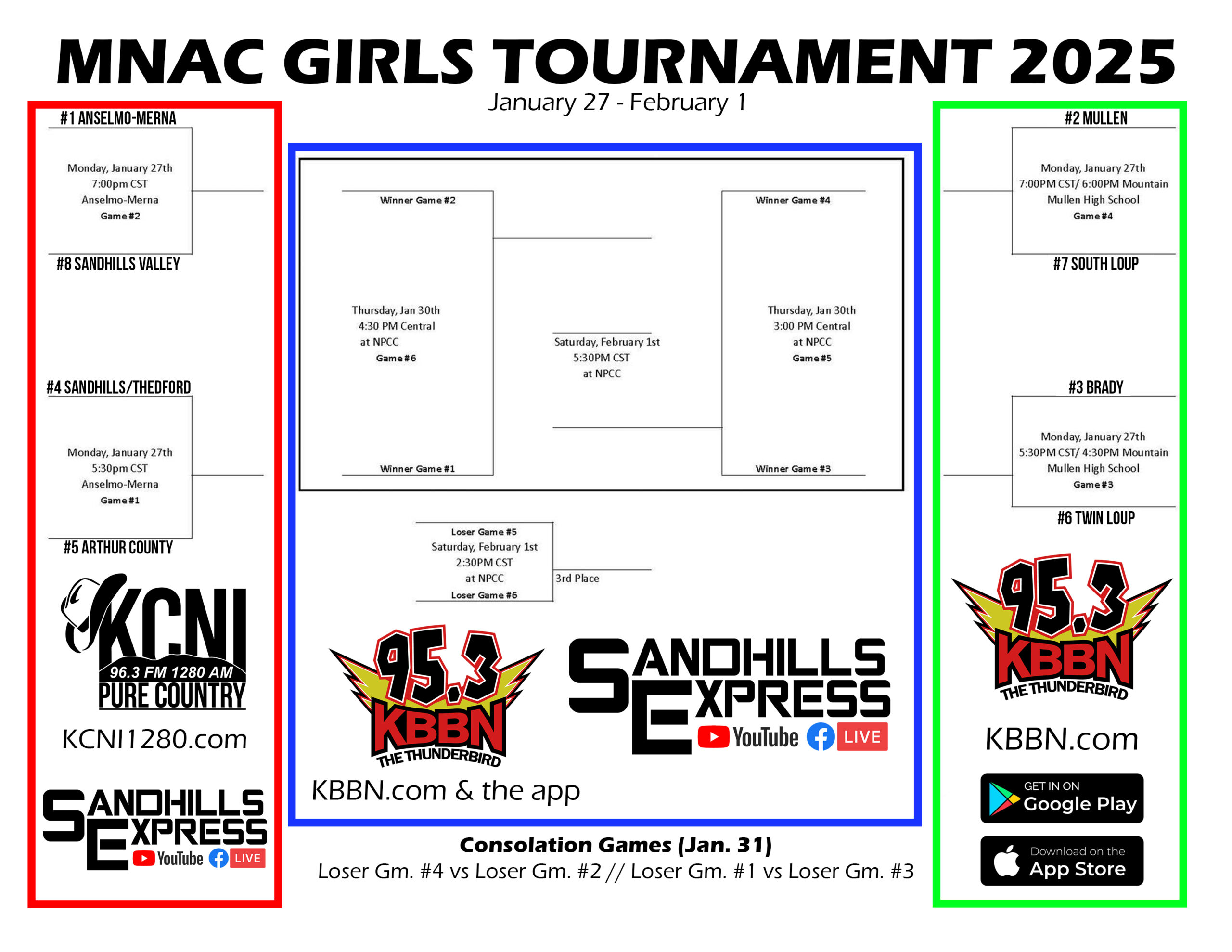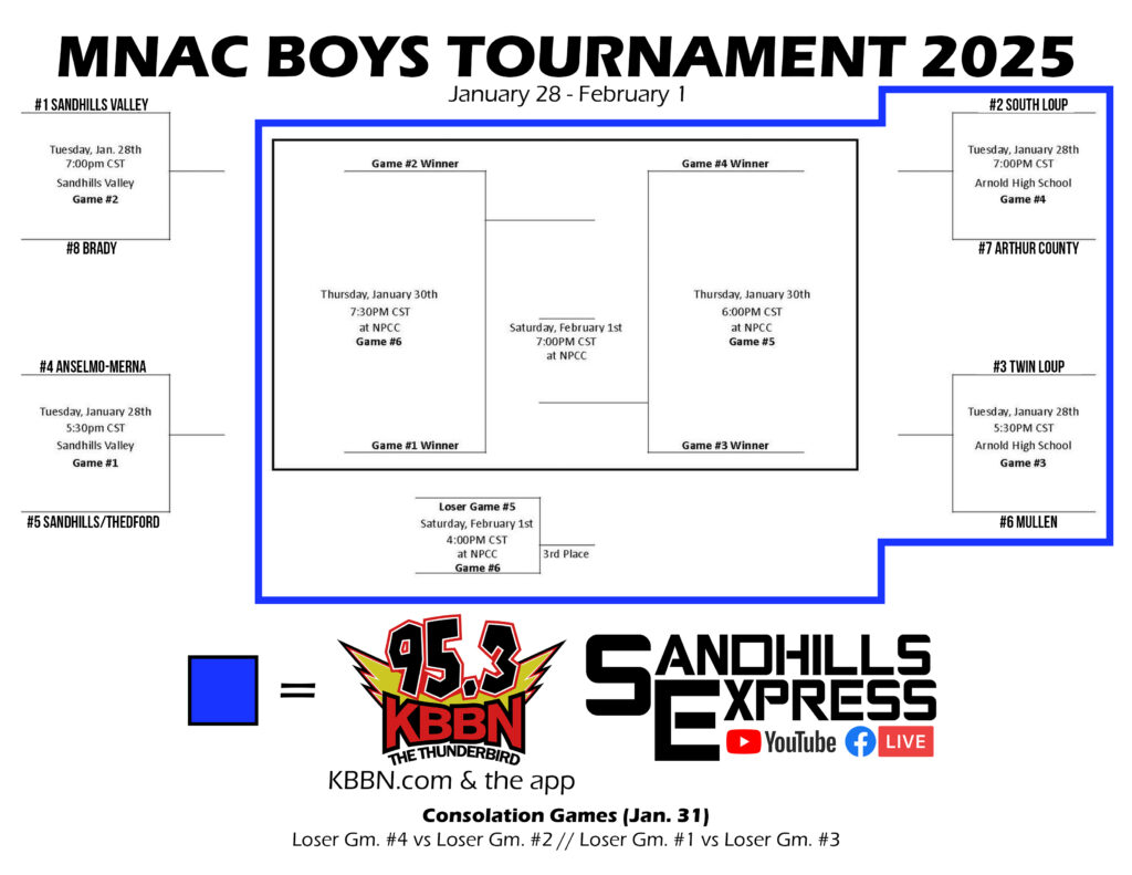 The semifinals, 3rd place consolation, and championship games will be broadcast on KBBN 95.3 FM and kbbn.com with a live video stream, accompanied by the radio call, available through sandhillsexpress.com