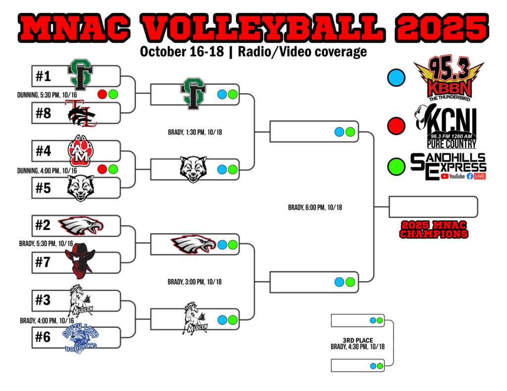 The final day of the Mid Nebraska Activities Conference volleyball tournament takes place today at Brady High School. Consolation bracket matches will begin at Noon in the reserve gym at Brady. Twin Loup will face Anselmo-Merna at noon followed by Sandhills Valley vs South Loup. The semifinals begin at 1:30 p.m. in the main gym. The opening semifinal will feature top seed Sandhills/Thedford vs #5 seed Arthur County followed by #2 seed Brady vs #3 seed Mullen. The third place consolation match will follow at 4:30 and the day will conclude with the championship match scheduled for 6 p.m.