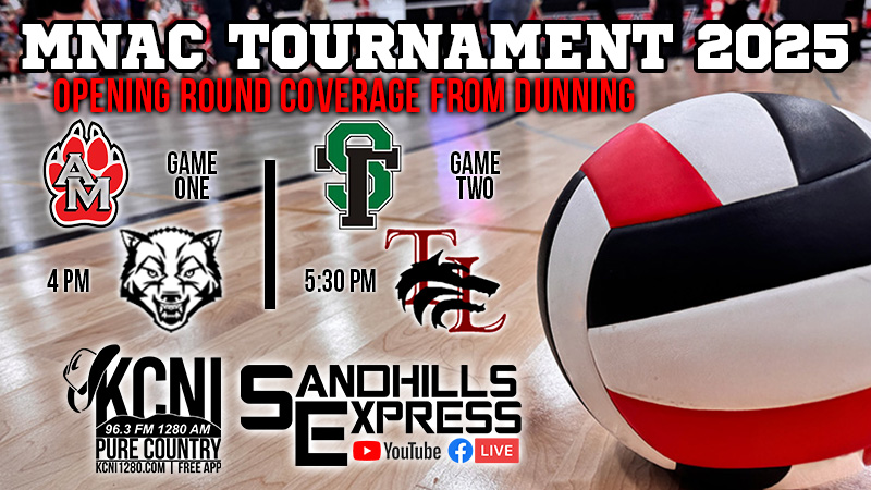 Tonight’s opening round matches in Dunning will be broadcast live on KCNI 1280 AM / 96.3 FM / kcni1280.com. The first match will feature Anselmo-Merna vs Arthur County at 4 followed by Sandhills/Thedford vs Twin Loup at 5:30. A live video stream of the matches, accompanied by the radio call will be available on the Sandhills Express Facebook Page and Sandhills Express You Tube Channel. Saturday coverage of the championship semifinals, third place consolation, and championship match will be broadcast on KBBN 95.3 FM / kbbn.com and video streamed through sandhillsexpress.com. All MNAC tournament matches will be best 2 out of 3 sets.