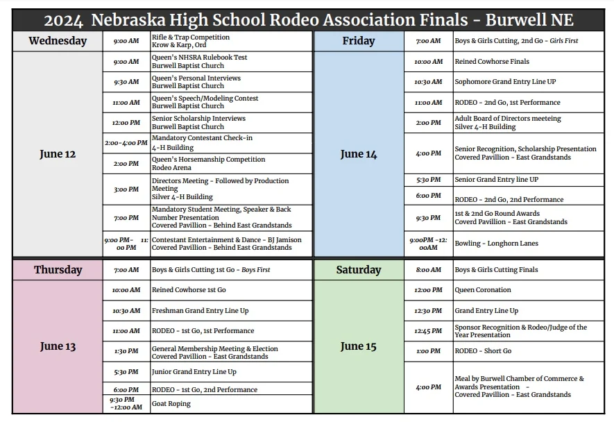 The Nebraska High School finals rodeo begins Thursday with the first go round. The second go round is on Friday with the short go scheduled for Saturday at 1 p.m.