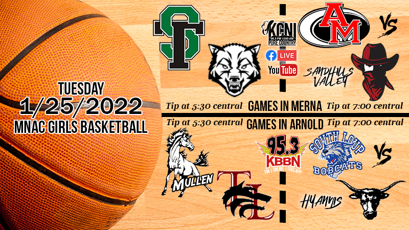 The Mid Nebraska Activities Conference basketball tournament continues Tuesday with girls second round action. In Merna, Sandhills/Thedford will play Arthur County followed by top seed Anselmo-Merna against Sandhills Valley. In Arnold, Mullen will face Twin Loup followed by the #2 seed South Loup against Hyannis. Games from Merna will be broadcast on KCNI 96.3 FM and will be video streamed live on the KCNI/KBBN You Tube page and the Sandhills Express facebook page. Games from Arnold will be broadcast on KBBN 95.3 FM and kbbn.com. Games at both locations begin at 5:30 p.m.