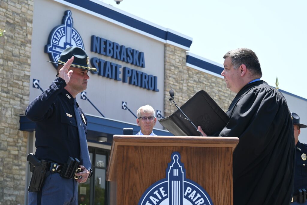 Waugh was appointed to serve as Nebraska’s Superintendent of Law Enforcement and Public Safety by Governor Jim Pillen and unanimously confirmed by the Nebraska Legislature. Colonel Waugh’s badge was pinned on by his wife, Julie. The Oath of Office was administered by the Hon. Patrick Lee, Judge of Nebraska’s 9th District Court.