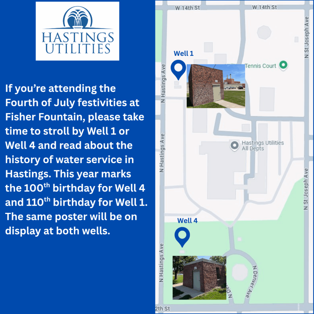 To celebrate the milestone birthdays, water crew members will display a poster titled “History of Water Service in Hastings, Nebraska” as well as modest decorations at each of the two wells. The poster tells the origins of water service in Hastings as well as present use.
