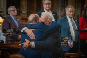 McKeon remained on the floor following his resignation speech, as his resignation did not take effect until the Legislature adjourned for the day at 12:13 p.m. Pillen will be tasked with appointing his replacement, but the governor had not publicly indicated when he might do so as of 3 p.m.