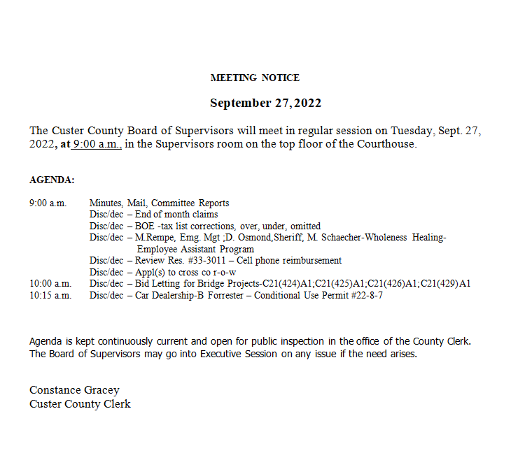 BROKEN BOW – The Custer County Board of Supervisors will convene on Tuesday, September 27 on the top floor of the Custer County Courthouse at 9 a.m.