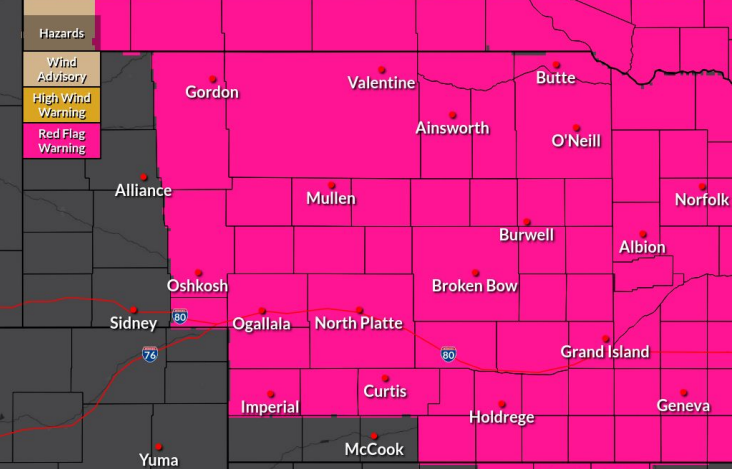 ● Much of western and north central Nebraska including Fire Weather Zones 204, 206, 208, 209, 210, and 219.